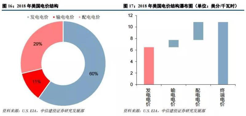 而美國的銷售電價主要由發(fā)電電價、輸電電價以及配電電價構(gòu)成。2018 年美國終端用電價格為 10.85 美分/ 千瓦時,其由上網(wǎng)電價(6.49 美分/千瓦時)、輸電電價(1.24 美分/千瓦時)和配電電價(3.12 美分/千瓦時)構(gòu) 成,三者占比分別為 60%、11%和 29%。