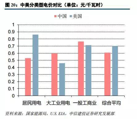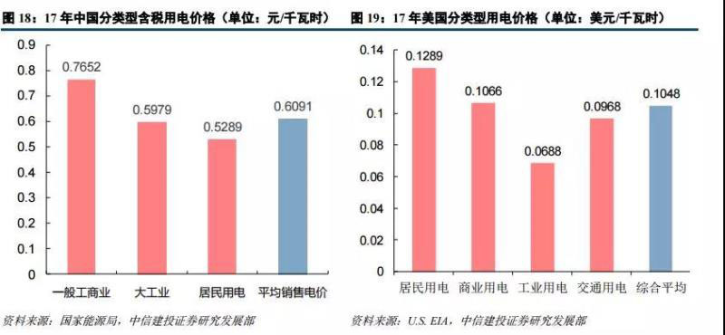 從 2017 年分類型用電價格的數(shù)據(jù)來看,中美電價水平整體較為接近,但美國居民用電價格大幅高于中國。我國一般工商業(yè)的平均用電電價較高,為 0.76524 元/千瓦時,大工業(yè)和居民用電的平均電價分別為 0.59785 元/ 千瓦時和 0.52894 元/千瓦時。而美國平均用電價格最高的用戶類型為居民用電,為 0.1289 美元/千瓦時,商業(yè)用 電、交通用電和工業(yè)的平均電價則相對較低,分別為 0.1066、0.0968 和 0.0688 美元/千瓦時(數(shù)據(jù)來自于 EIA, 各地州政府或有少量稅費)。