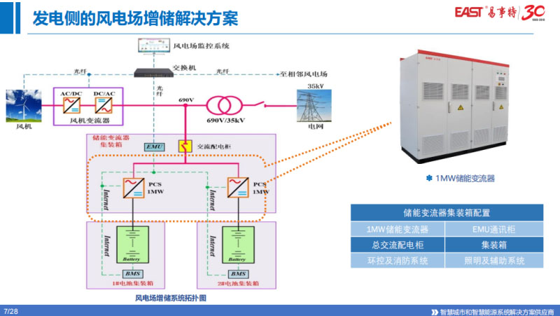 首先是關(guān)于發(fā)電側(cè)的解決方案,這是風(fēng)電場增儲(chǔ)的解決方案。風(fēng)電場特殊的電壓等級(jí)決定了增儲(chǔ)系統(tǒng)的核心是1MW儲(chǔ)能變流器,我們這么多年從光伏一直走過來,技術(shù)積累是足夠的,所以風(fēng)電場增儲(chǔ)的解決方案中我們主推自己研發(fā)的1MW儲(chǔ)能變流器,這是我們的優(yōu)勢。其次是光伏電站增儲(chǔ)解決方案,我們解決了很多相關(guān)核心問題,例如對直流母線電壓的穩(wěn)定性控制問題以及對組件的MPPT追蹤問題,包括我們怎么去控制輸出功率以及整個(gè)組件追蹤策略,以及到底怎么配合AGC調(diào)度系統(tǒng)的運(yùn)行等。這是我們做的一些相關(guān)的工程實(shí)驗(yàn),是可以完全達(dá)到所需要的效果。另外,我們基于這個(gè)解決方案的平臺(tái)還推出了離網(wǎng)微電網(wǎng)的解決方案,應(yīng)用到海外的微電網(wǎng)項(xiàng)目中這是我們在西北做的光伏電站增儲(chǔ)項(xiàng)目,效果還是比較明顯的。