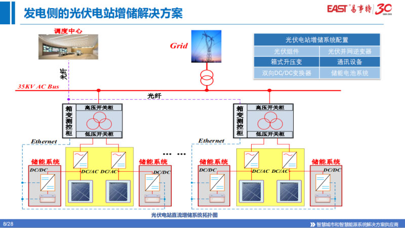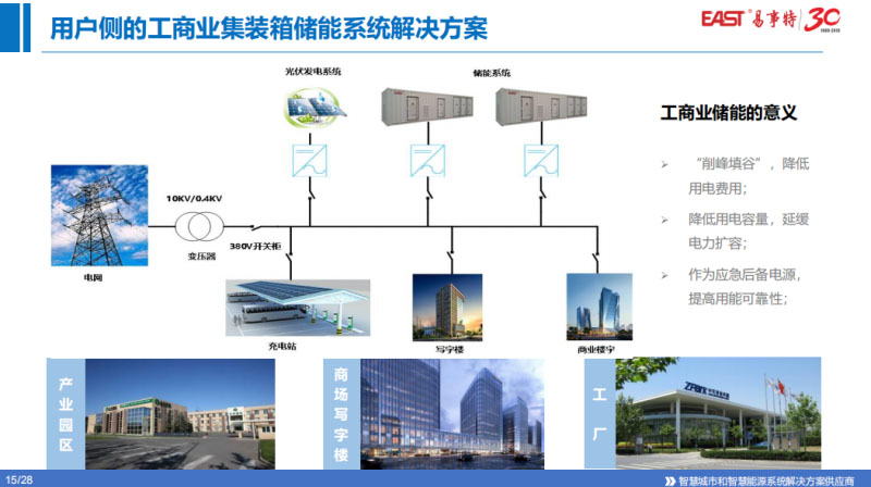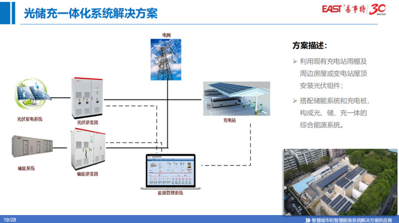 第三是關(guān)于用戶側(cè)的,這個(gè)就探討得比較多。我記得去年年上半年的時(shí)候,用戶儲(chǔ)能的項(xiàng)目的建設(shè)是一波高過一波。但是今年上半年整體市場反應(yīng)是非常冷淡的。也就是說今年用戶側(cè)項(xiàng)目趨于保守,至于原因是什么,我覺得有好多深層次的問題。我們?nèi)ツ曜隽舜罅康挠脩魝?cè)儲(chǔ)能項(xiàng)目,包括在江蘇、鎮(zhèn)江做了很多精品工程包括浙江衛(wèi)視都去現(xiàn)場采訪過。這是相對來講比較簡單的一種系統(tǒng)解決方案,門檻低,整個(gè)模式和測算都是相對固定,風(fēng)險(xiǎn)比較小,整體解決方案無非這么幾個(gè),按照相關(guān)的控制策略去充去放等而已。在南方地區(qū),這是和廣州供電局做的一個(gè)儲(chǔ)能成套裝置采購項(xiàng)目。它既可以作為獨(dú)立電源使用,又可以跟配網(wǎng)互動(dòng),在用電低谷時(shí)充電,用電高峰時(shí)放電,削峰填谷、提高電能質(zhì)量、緩解用電高峰期供電壓力。這是我們最近在交付的廣州發(fā)展集團(tuán)的光儲(chǔ)項(xiàng)目。在已有光伏發(fā)電系統(tǒng)上增儲(chǔ),著力打造光儲(chǔ)一體化系統(tǒng),解決棄光問題,提高新能源消納率,以及平滑光伏系統(tǒng)功率波動(dòng),提升電能輸出質(zhì)量。