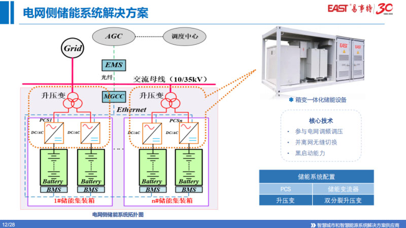 第二部分是關(guān)于電網(wǎng)側(cè)儲(chǔ)能的解決方案,一個(gè)是電氣,核心設(shè)備相關(guān)核心技術(shù)的研究,包括黑啟動(dòng)、并離網(wǎng)無縫切換,第二個(gè)是關(guān)于設(shè)備跟電網(wǎng)的通訊調(diào)度控制的方案。這是我們做的一些相關(guān)的工程實(shí)驗(yàn)波形,解決了一大堆調(diào)壓調(diào)頻還有黑啟動(dòng)等核心關(guān)鍵技術(shù)問題,。這是去年11月份的儲(chǔ)能項(xiàng)目,我們第一批參與這個(gè)項(xiàng)目的企業(yè)。這里頭,背景是國家能源局批復(fù)的首個(gè)電池儲(chǔ)能試驗(yàn)示范項(xiàng)目,這方面我們具備所有的技術(shù)核心開拓的能力。