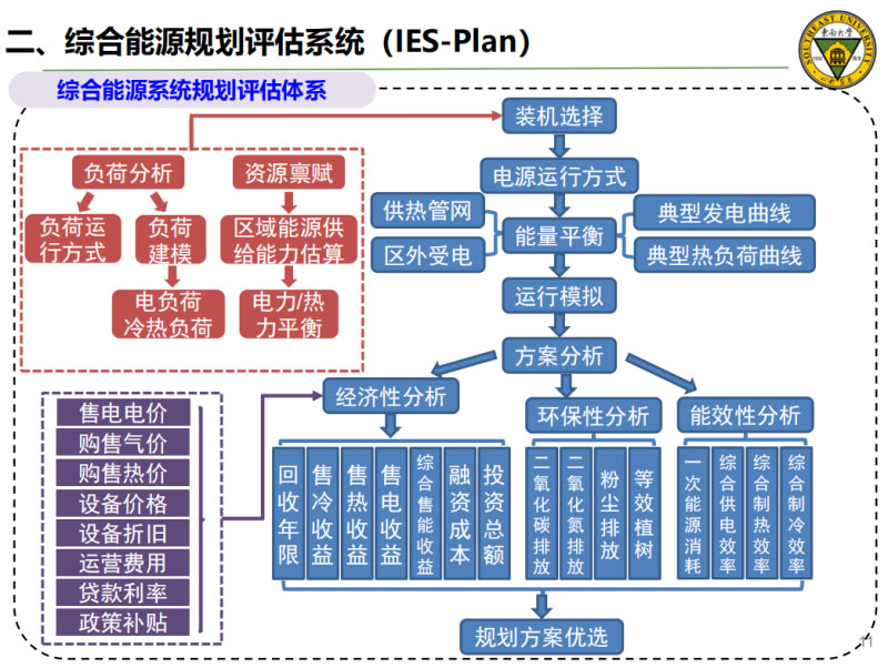 這是一些綜合能源的業(yè)務(wù)模式類的東西,不再多講。下面重點(diǎn)地講一下,我們團(tuán)隊(duì)在綜合能源這一塊的工作,我們認(rèn)為能夠更好地服務(wù)于市場(chǎng)驅(qū)動(dòng)的,而不是哪一個(gè)公司或者哪一個(gè)領(lǐng)導(dǎo)意志驅(qū)動(dòng)的,我們所需要的一些軟件或者技術(shù)。包括綜合能源系統(tǒng)的規(guī)劃。這個(gè)平臺(tái)我們已經(jīng)在一個(gè)網(wǎng)站上面發(fā)布出來(lái),免費(fèi)開(kāi)放給大家去用。因?yàn)樽罱@一年多以來(lái),經(jīng)常會(huì)有企業(yè)過(guò)來(lái)找我們了解,我們這邊有沒(méi)有改造的空間。這邊想開(kāi)展一些綜合能源服務(wù),采用什么樣的業(yè)務(wù)模式比較好。我們應(yīng)該投資一些什么樣的設(shè)備。我們?nèi)ジ麄兘鉀Q這些問(wèn)題,其實(shí)也蠻花時(shí)間的。我想,我們開(kāi)發(fā)這樣一個(gè)工具軟件,這也是比較智能化比較傻瓜的。有一點(diǎn)專業(yè)知識(shí)的話,就可以去做這個(gè)事情。另外有了規(guī)劃之后可能還需要一些設(shè)計(jì),我們也輔助地做一些綜合能源規(guī)劃的設(shè)計(jì)。還有很多公司在做綜合能源的實(shí)驗(yàn)室,包括綜合能源系統(tǒng)建成以后,我想更加好地分析系統(tǒng)的動(dòng)態(tài)過(guò)程或者性能評(píng)估這樣一些方面。我們也做了一個(gè)綜合能源的仿真系統(tǒng)包括實(shí)時(shí)仿真系統(tǒng)規(guī)劃這個(gè)事情我們一直認(rèn)為是開(kāi)展綜合能源業(yè)務(wù)的第一步要去做的事情或者最有利的工具。國(guó)網(wǎng)公司在提三型兩網(wǎng),前面幾個(gè)專家特別好地介紹了泛在電力物聯(lián)網(wǎng)的概念。我也翻看了這一塊的文件。關(guān)于重要的能力支撐,有綜合能源規(guī)劃平臺(tái)的建設(shè)。我們開(kāi)發(fā)了一個(gè)IES-Plan一站式的規(guī)劃平臺(tái)。它的功能有很多,包括規(guī)劃場(chǎng)景的智能聚類、多能設(shè)備的模型構(gòu)建、用戶自定義設(shè)備等等。這是我們綜合能源系統(tǒng)規(guī)劃平臺(tái)的基本評(píng)估體系。因?yàn)闋砍兜募夹g(shù)比較多,我簡(jiǎn)單地講一下,我們是從負(fù)荷和系統(tǒng)資源稟賦開(kāi)始,輸入各類的價(jià)格或者系統(tǒng)的參數(shù),借助我們的能量平衡和運(yùn)行模擬的分析,最后通過(guò)經(jīng)濟(jì)性、可靠性、安全性來(lái)進(jìn)行分析和評(píng)估,再進(jìn)行規(guī)劃方案的優(yōu)選。