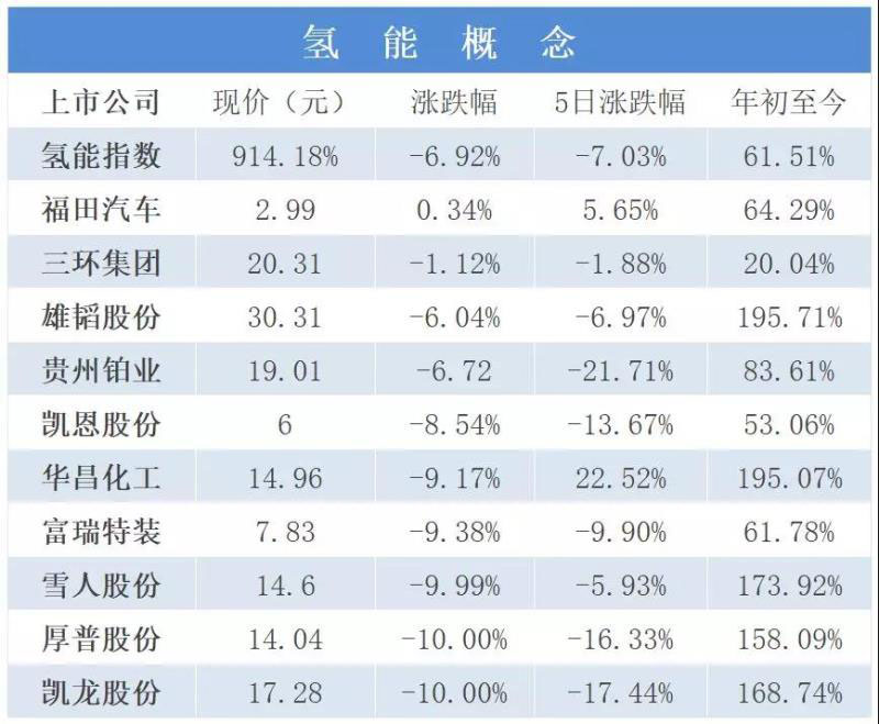 氫能產業(yè)如此火熱,但是這種火熱是否可持續(xù)呢?俗話說春江水暖鴨先知,股市是經濟的晴雨表,同時也可以直接反應一個行業(yè)的市場情況。截至4月25日,氫能指數整體下跌6.92%,燃料電池指數整體下跌7.49%,具體相關概念上市公司情況如下: