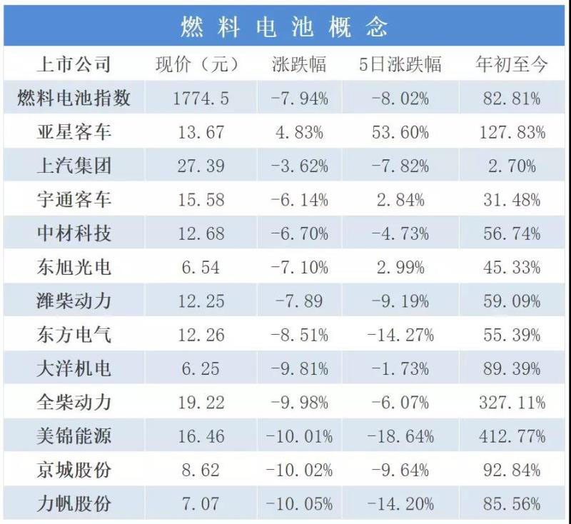 燃料電池方面,從年初至今的變化上看,同氫能概念大致相同,燃料電池指數和相關上市公司整體上漲,通過從最近一個周的周期上看,除亞星客車漲跌幅4.83%呈正數外,其余上市公司漲跌幅均為負數,而且一半以上漲跌幅接近甚至超過了-10%,燃料電池指數在5日內的漲跌幅為-8.02%。