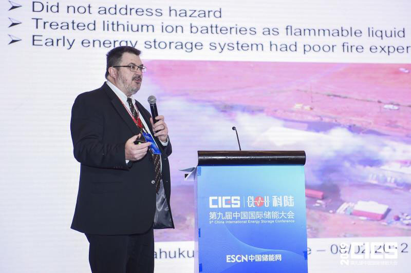中國儲能網(wǎng)訊:4月24-26日,由中國化學(xué)與物理電源行業(yè)協(xié)會儲能應(yīng)用分會主辦的第九屆中國國際儲能大會在浙江省杭州市洲際酒店召開。在4月24日下午的“國際儲能市場與政策專場”,美國儲能系統(tǒng)技術(shù)委員會主席、TüV 南德意志集團(tuán)全球風(fēng)險顧問公司常務(wù)顧問James Biggins先生在會上分享了主題報告《儲能電站的損失預(yù)防措施》,以下為演講實(shí)錄: