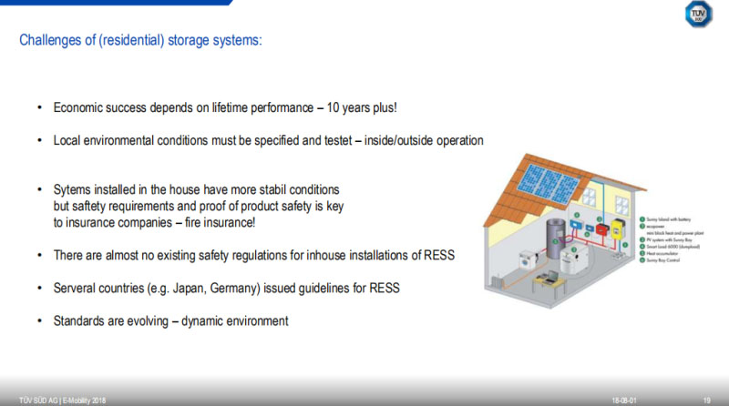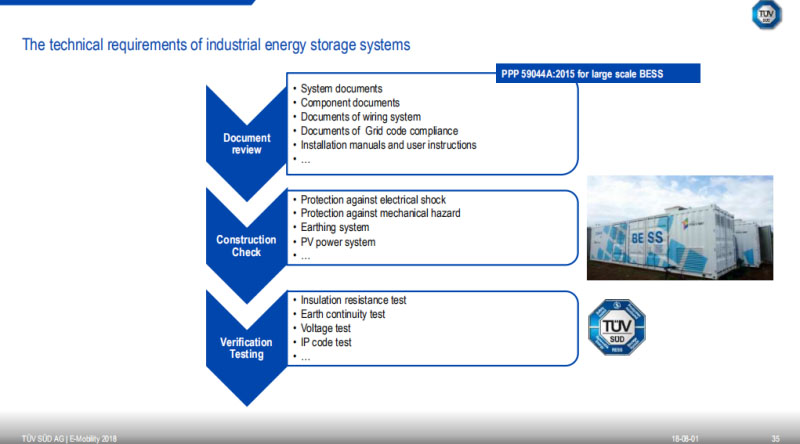 對(duì)于上述這些市場(chǎng),,如果遇到了一個(gè)沒有標(biāo)準(zhǔn)的地區(qū)或者市場(chǎng)的話,其實(shí)我們只要把剛剛看到的那些準(zhǔn)則作為參照就可以了。所以說我們可以把TüV SüD的認(rèn)證、TüV SüD的測(cè)試百分之百用在你的系統(tǒng)上,這也是一種保障。我們的這個(gè)LOGO是全球性的,是國(guó)際性,但是不是全世界都認(rèn)識(shí)它,在美國(guó)可能有部分人認(rèn)識(shí)它,在歐洲基本上全部都認(rèn)識(shí)它,就是我們的LOGO。我們還有專門給大規(guī)模儲(chǔ)能系統(tǒng)或者是家用儲(chǔ)能系統(tǒng)認(rèn)證。對(duì)于研發(fā)測(cè)試、性能測(cè)試、可靠性測(cè)試、安全性測(cè)試,我們?cè)谌澜缍伎梢赃M(jìn)行,尤其在北美、歐洲、韓國(guó)、中國(guó),明年在泰國(guó)還將建立一個(gè)大的電池實(shí)驗(yàn)室。同時(shí),在電池檢測(cè)上面我們有著相當(dāng)豐富的經(jīng)驗(yàn),我們目前已經(jīng)測(cè)試過超過6000款不同的電池,以前主要是在動(dòng)力電池方面進(jìn)行測(cè)試,近年來也在ESS電池方面進(jìn)行測(cè)試。這個(gè)是一個(gè)大電池實(shí)驗(yàn)室,它提供一個(gè)安全的環(huán)境,因?yàn)殡姵厥菚?huì)有爆炸情況出現(xiàn)的,會(huì)使電池處于超出極限情況。在一個(gè)極端情形去做測(cè)試,我們可以在這個(gè)安全玻璃前面觀看這個(gè)電池從最初的情況到極端情況整個(gè)的變化過程。
