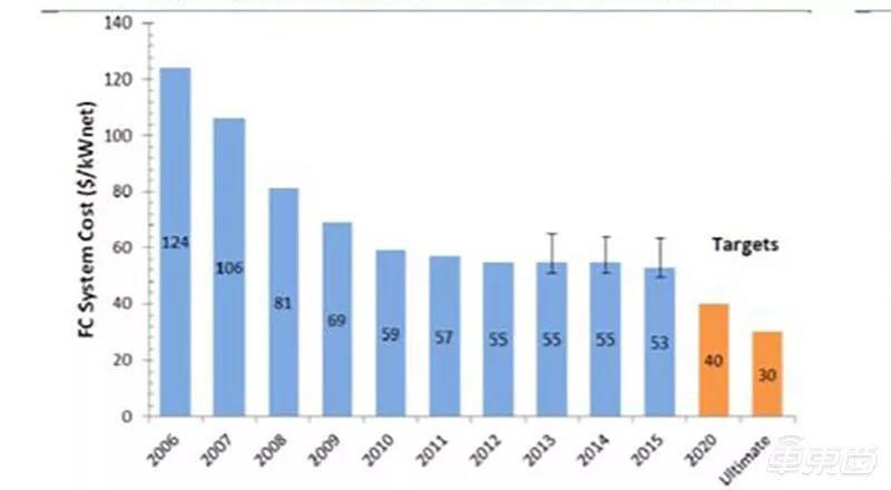 ▲美國(guó)能源部測(cè)算的燃料電池成本下降曲線