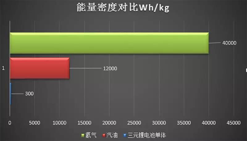 若要更直觀地理解這個(gè)數(shù)據(jù),可以換算成電動(dòng)車(chē)?yán)锍S玫腤h/kg能量密度單位。高能量密度的三元鋰電池電芯單體約為300Wh/kg,汽油約為12000Wh/kg,而氫氣達(dá)到了40000Wh/kg,是汽油的3.3倍、三元鋰電池單體的133倍。