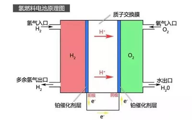 質(zhì)子交換膜的兩側(cè)是鉑(Pt)催化劑,氫氣通到陽(yáng)極板后,在鉑催化劑的作用下,失去電子變成質(zhì)子,再通過(guò)質(zhì)子交換膜與另一側(cè)的氧原子結(jié)合生產(chǎn)水。