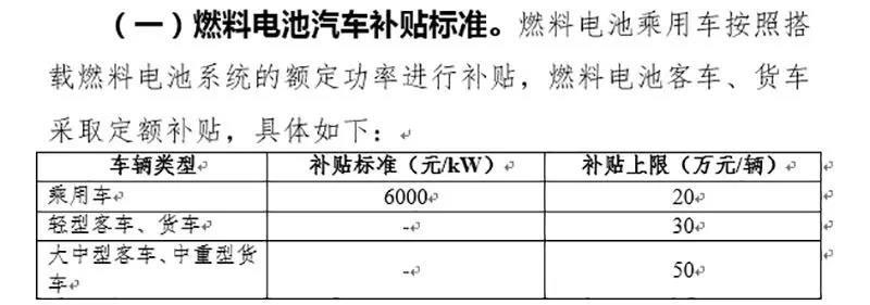 2018年,財(cái)政部、工信部、科技部、發(fā)改委聯(lián)合發(fā)布了《關(guān)于調(diào)整完善新能源汽車(chē)推廣應(yīng)用財(cái)政補(bǔ)貼政策的通知》,規(guī)定燃料電池乘用車(chē)按搭載的電池額定功率進(jìn)行補(bǔ)貼,補(bǔ)貼標(biāo)準(zhǔn)為6000元/kW,上限為20萬(wàn)/輛;客車(chē)、貨車(chē)進(jìn)行定額補(bǔ)貼,依據(jù)車(chē)型大小補(bǔ)貼上限為30-50萬(wàn)/輛。