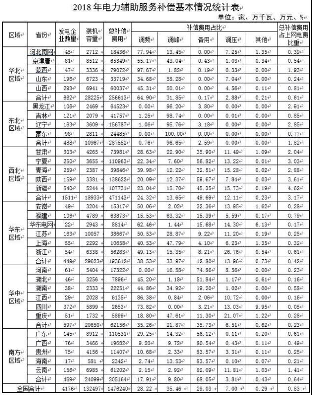 2018年,全國(guó)除西藏外31個(gè)?。▍^(qū)、市、地區(qū))參與電力輔助服務(wù)補(bǔ)償?shù)陌l(fā)電企業(yè)共4176家,裝機(jī)容量共13.25億千瓦,補(bǔ)償費(fèi)用共147.62億元,占上網(wǎng)電費(fèi)總額的0.83%(詳見附件)。