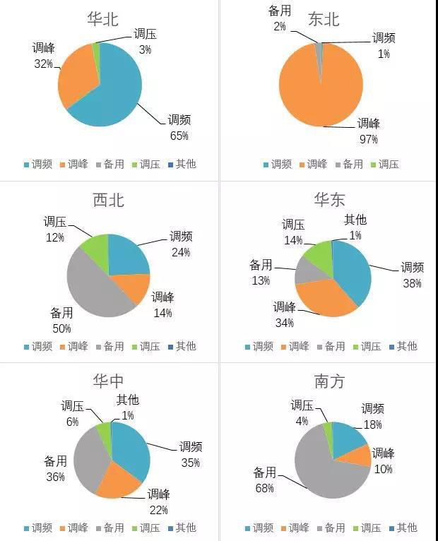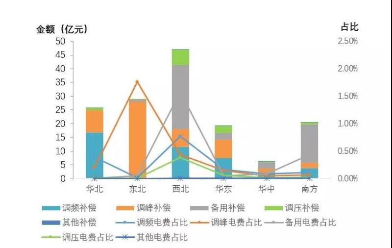 從分項(xiàng)電力輔助服務(wù)補(bǔ)償費(fèi)用來(lái)看,調(diào)峰、調(diào)頻和備用補(bǔ)償費(fèi)用占總補(bǔ)償費(fèi)用的90%以上。其中,東北、西北區(qū)域調(diào)峰補(bǔ)償力度最大,西北、華北區(qū)域調(diào)頻補(bǔ)償力度最大,西北、南方區(qū)域備用補(bǔ)償力度最大。總體來(lái)看,西北區(qū)域整體電力輔助服務(wù)補(bǔ)償力度最大(見圖3)。