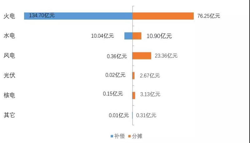 從能源類型的角度來(lái)看,電力輔助服務(wù)補(bǔ)償費(fèi)用的補(bǔ)償與分?jǐn)傎M(fèi)用對(duì)比如下(見圖5)。