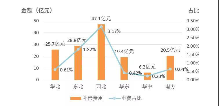 從電力輔助服務(wù)補(bǔ)償總費(fèi)用來(lái)看,補(bǔ)償費(fèi)用最高的三個(gè)區(qū)域依次為西北、東北和華北區(qū)域,西北區(qū)域電力輔助服務(wù)補(bǔ)償費(fèi)用占上網(wǎng)電費(fèi)總額比重最高,為3.17%,華中區(qū)域占比最低,為0.23%(見圖1)。