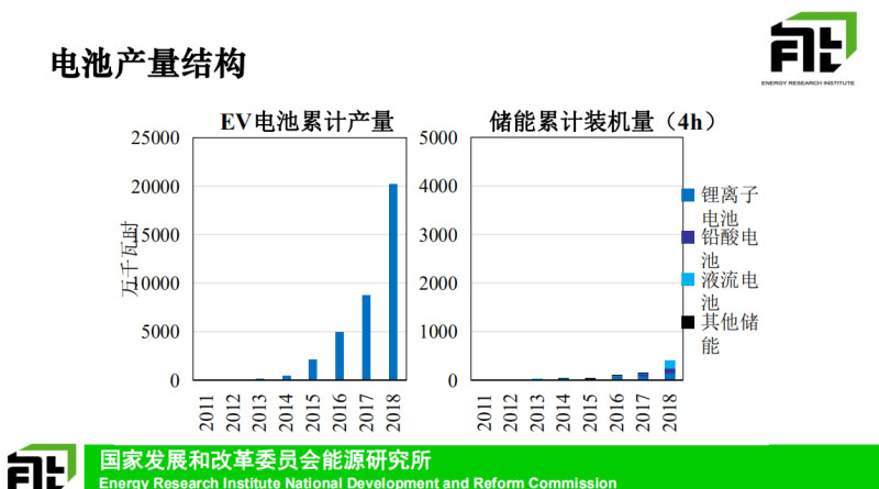 再來看一下就是電池產(chǎn)量的結(jié)構(gòu),這個圖其實(shí)想說明一個問題就是實(shí)際上目前這個電動化儲能更大一部分來自電動汽車,總的累計的電池的產(chǎn)量的一個統(tǒng)計,到2018年,總的這個電動汽車的動力電池它的累計的產(chǎn)量已經(jīng)大約達(dá)到2億千瓦時這個規(guī)模,這個就是固定式儲能的統(tǒng)計,除了鋰離子電池之外也涵蓋了一些其他的典型的電池,包括鉛酸這些的,總的裝機(jī)規(guī)模大約是1G瓦,也就是四百萬千瓦時這樣的規(guī)模。所以相比于這個動力電池的市場規(guī)模來講的話是非常小的,大約也就是2%的這樣的規(guī)模??傮w來講的話,電動汽車這樣的數(shù)量規(guī)模推動了整體電池成本下降,如果電動汽車本身作為一個儲能的單元,來參與到整體的這個電力系統(tǒng)儲能來講的話,它會產(chǎn)生非常重要的戰(zhàn)略的價值,比如說我們這個圖里面把這個電動汽車和可再生能源之間進(jìn)行了一個聯(lián)系,可以幫助我們上游吸納更多的可再生能源,反過來新能源越來越多之后,里面有更多的新能源占比,可以解決目前電動汽車的爭議,中國大量還是媒電,排放水平是逐步的降低??傮w來講他們之間的協(xié)作,通過儲能這種方式產(chǎn)生這樣的互動協(xié)作可以解決各自在發(fā)展過程當(dāng)中面臨的關(guān)鍵的問題。