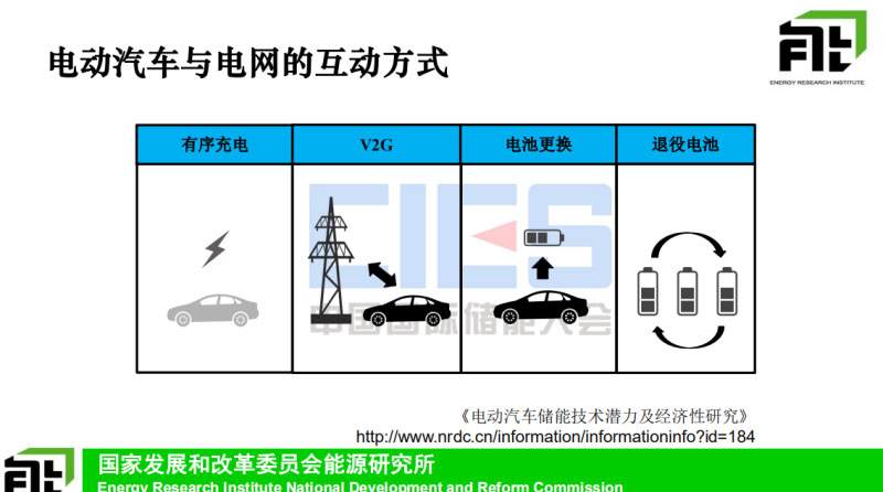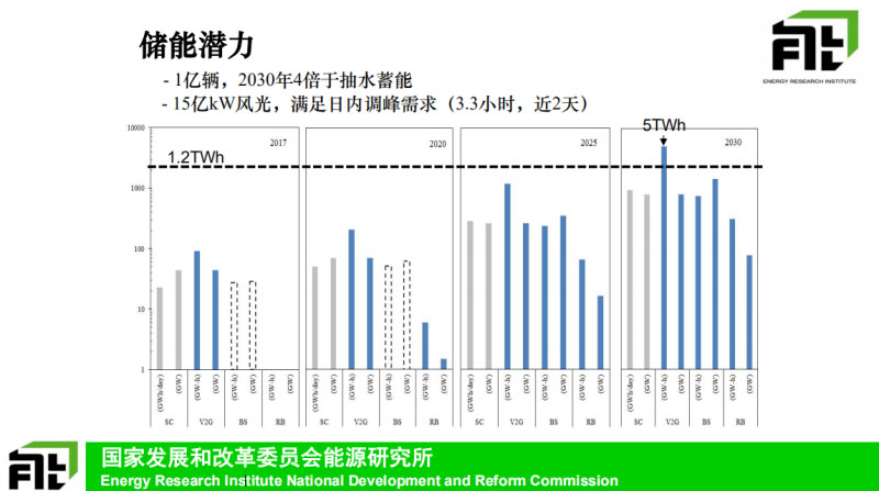 我們這里大致看一下就是電動汽車與電網(wǎng)互動的幾種典型的模式,電池更換還有這個第一類稍微有點(diǎn)不同,是一個單向的通過調(diào)節(jié)充電時間,去實(shí)現(xiàn)虛擬儲能的作用,后面幾種是電動汽車跟電網(wǎng)雙向驅(qū)動的模式,這個大家比較了解,不具體說了,這也是我們可能兩年前做的一個研究的,就是假設(shè)2030年有一億輛電動汽車的規(guī)模,來評估幾種儲能方式,總的儲能的這樣能力。通過V2G這樣來講的話,可以提供5T瓦時的儲能能力這樣的規(guī)模的話差不多就是4倍這樣的規(guī)模,按照8小時的放電時間,1.5億千瓦的這種資源去評估的。