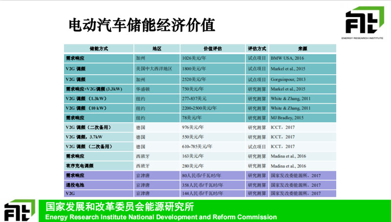 剛剛說的是一個技術(shù)潛力這個問題,再看一下電動汽車儲能的經(jīng)濟(jì)的這個問題,這個國外研究比較多,收集了相關(guān)的一些研究成果,上面幾類在德國美國歐洲的一些國家,他們所做的案例的研究,有部分試點(diǎn)項目,有一部分就是研究的一個結(jié)果,總的來講的話,我們看到如果電動汽車可以去參與一些比如說像調(diào)頻這種服務(wù)的話,它其實(shí)產(chǎn)生的這樣的價值還是非常高的,差不多每年可以超過兩千,就是比較高的情況下可以超過兩千美元。國內(nèi)也有一些案例研究,總的來講的話就是如果我們最后的歸類來講的話,電動汽車可以實(shí)現(xiàn)跟電網(wǎng)更多的分離,比如說可以把電池跟車運(yùn)行可以結(jié)合的話,它的價值會更高一些,如果使用車載電池的話,V2G相對來說更低一些,采用這種單向的調(diào)節(jié)的話,它的價值可能又會更低一些,總體來講的話這樣的規(guī)律,高中低這樣的價值的排列,跟國外的情況也有比較相似的地方。