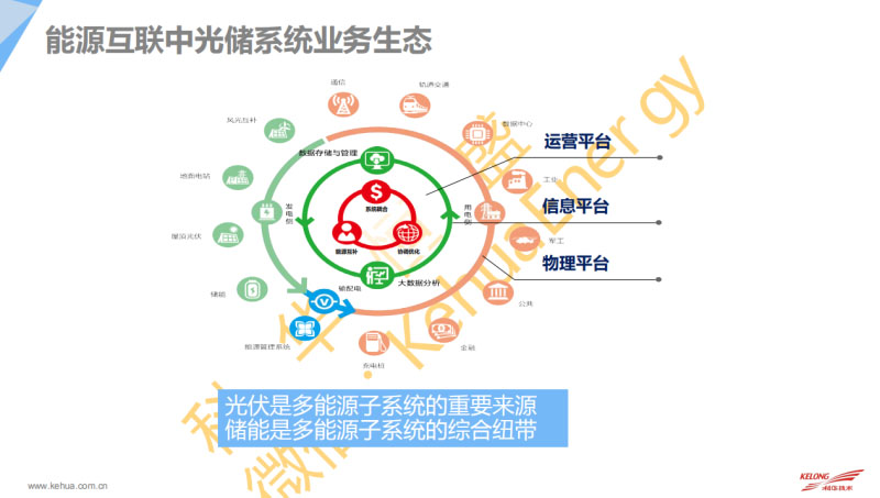 曾春保:各位領(lǐng)導(dǎo)、各位專家,大家上午好!我在這里代表科華恒盛做《能源互聯(lián)網(wǎng)當中光儲探討和解決方案》的專題報告。主要從這么幾個方面來跟大家探討。第一部分是對于光儲系統(tǒng)的業(yè)務(wù)生態(tài)的理解。最右邊那個圖是一個我們的綜合能流圖。光伏有分布式的,包括一些大型的電站,通過一些變電站,最終到我們的需求側(cè),也就是負荷,負荷的話包括了電動汽車充電、數(shù)據(jù)中心等等,這些綜合的一個能流,那其中我們把它轉(zhuǎn)換成我們的一個應(yīng)用場景。那應(yīng)用場景的話,科華恒盛這邊的理解就是把發(fā)電、配電轉(zhuǎn)到具體的應(yīng)用領(lǐng)域,包括工業(yè)、金融、軌道交通等場合。這邊的話今天主要講光儲,那光伏是整個多能源里面重要的能源的來源。