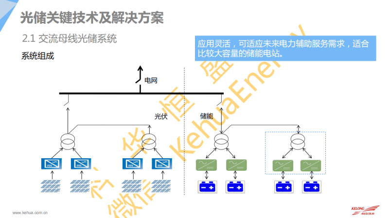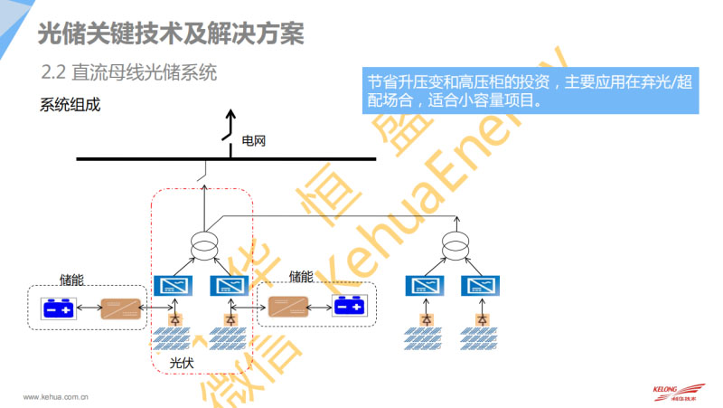 第二部分其實大家看這個也是會比較簡單,就是直流母線,它的應(yīng)用特點可以看到儲能跟光伏是通過直流的一個偶合,然后并到我們的電網(wǎng),那這種的話,它的特點就是可以跟前面的交流母線省掉了變壓器跟相關(guān)的,但是這種應(yīng)用的話也有一些限制,每個直流端不去配對應(yīng)的儲能會比較分散的,這種也有應(yīng)用的需求,成本比較低。