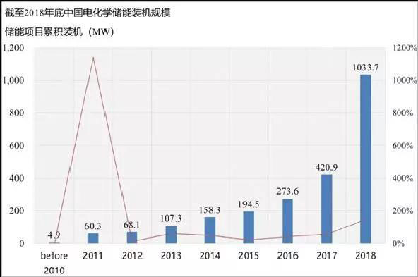 在各儲(chǔ)能種類中,電化學(xué)儲(chǔ)能是其中最矚目、增長(zhǎng)最快速的儲(chǔ)能類別。根據(jù)中國(guó)化學(xué)與物理電源行業(yè)協(xié)會(huì)在大會(huì)上發(fā)布的統(tǒng)計(jì)報(bào)告,2018年中國(guó)電化學(xué)儲(chǔ)能市場(chǎng)累計(jì)裝機(jī)功率規(guī)模達(dá)到1033.7MW,首次突破GW水平,2018年復(fù)合增長(zhǎng)率達(dá)147%。