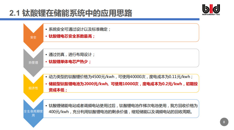 第三個,經(jīng)濟性。以前我們沒有把動力電池和儲能電池嚴格區(qū)分開來,現(xiàn)在我們按應(yīng)用需求提供不同功能的產(chǎn)品,從而更好的推廣鈦酸鋰電池的應(yīng)用。鈦酸鋰電池應(yīng)用的瓶頸主要是價格方面,比如動力電池鈦酸鋰的要求高,價格昂貴,現(xiàn)在大概是4500元/度,可以使用4萬次,度電成本是0.11元/千瓦時,但是初期成本太高,除了在一些不得不用它的場合,比如軌道交通場合,人家只敢用鈦酸鋰電池,不敢使用磷酸鐵鋰,其他場合,大家想用也沒法盈利。如果在儲能領(lǐng)域使用動力型的鈦酸鋰電池,沒有企業(yè)會接受,所以我們公司針對這個市場推出了我們動力儲能型的鈦酸鋰電池?,F(xiàn)在我們的儲能用鈦酸鋰電池可以達到2千元/度電,可以使用1萬次,是在1C充放的情況下,度電成本是0.2元/瓦時,和動力電池比起來,它的初期投資成本會偏低一些。