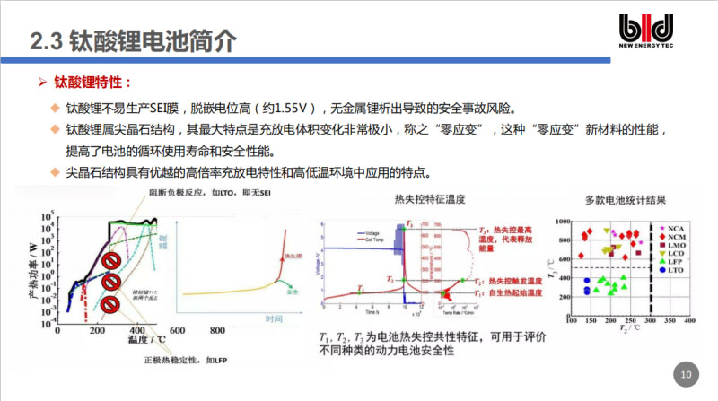 大家都在說鈦酸鋰為什么安全。材料本身來講非常安全。我們負極采用的是鈦酸鋰,鈦酸鋰的脫嵌電位高約1.55V,不易生產(chǎn)SEI膜,沒有金屬鋰析出導致的安全風險。鈦酸鋰屬于尖晶石結(jié)構(gòu),充放電過程中晶體結(jié)構(gòu)的體積變化非常小。一般來說,因為我們有SEI膜,所以在我電池風險控制鏈條反應(yīng)中,SEI膜和負極反應(yīng)不存在,引發(fā)的安全風險性就非常小。這個圖就是通過加速測試來測得的,我們發(fā)生各種電池的熱失控觸發(fā)溫度、熱失控的最高溫度,可以看到鈦酸鋰的溫度是非常低的,它也是非常安全的。