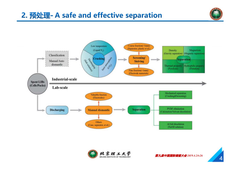 動力電池退役之后我們對它進(jìn)行處理處置將面臨很嚴(yán)重的挑戰(zhàn),對于單體電池、模組或電池模塊,其組份非常復(fù)雜,我們從左邊可以看到大概內(nèi)部各組分的分配比例,目前國際上,包括中國在內(nèi),回收處理方式首先要進(jìn)行安全和高效的拆解,之后要根據(jù)它的物理性質(zhì)進(jìn)行前處理或者預(yù)處理,隨后進(jìn)行活法和濕法的深度處理。