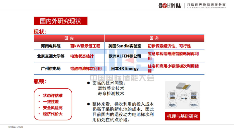 這是當(dāng)前梯次利用動力電池的現(xiàn)狀。實(shí)際梯次利用這個概念并不是一個很新的概念,在七八年前的時(shí)候就已經(jīng)展開了電池的梯次利用工作了。當(dāng)時(shí)一直存在一個問題就是,大規(guī)模的梯次利用是很大的一個難題。再一個,大規(guī)模使用以后的安全性問題,包括在梯次利用以后的電池性能也是有很大下降的。特別是梯次利用以后的動力電池,不適合用于高倍率的放電,只能做0.15C左右的充放電倍率。