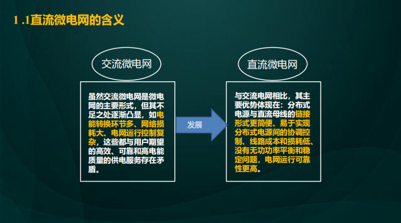 為什么會提到這樣的概念呢?我們知道傳統(tǒng)的交流微電網(wǎng),雖然是目前的主要形式,但是還是面臨很多問題,比如說現(xiàn)在的電能轉(zhuǎn)換環(huán)節(jié)非常的多,像光伏儲能都需要通過DCAC進行能量轉(zhuǎn)換,所以它的損耗比較大的,網(wǎng)絡損耗也是比較大,控制也是比較復雜的。相對于交流微電網(wǎng),我們認為通過直流母線將分布式電源連接在一起這樣的形式更加簡單,易于控制,線路損耗更低,而且沒有功角穩(wěn)定性的問題,可靠性更高,這也是將研究的焦點從交流微電網(wǎng)轉(zhuǎn)向直流微電網(wǎng)的原因之一。