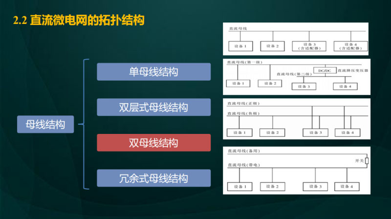 第一個,是電壓等級,我們知道因為直流是一個全新的系統(tǒng),事實上目前也就在數(shù)據(jù)中心以及艦船航天等等領域有直流的配電網(wǎng)絡的應用,實際上在IEC國際標準里面,沒有關于直流電壓等級的定義,這也是我們工作組目前所承擔的一項標準化工作,就是關于我們未來這個怎么去定義一個直流微電網(wǎng)當中的電壓等級,關于這個電壓直流選取要考慮幾個原則:第一個,配電的容量,包括供電的距離以及供電的容量;第二個,考慮和現(xiàn)有設備的兼容性和通用性,比如說現(xiàn)在在交流系統(tǒng)當中用到的模塊以及這種電容器,他們現(xiàn)在已經(jīng)形成了規(guī)?;漠a(chǎn)品,未來定義的這個電壓等級,能否兼容現(xiàn)有產(chǎn)品是非常重要考慮的點;第三個,與現(xiàn)有交流設備的融合,怎樣使交流設備以最小的成本經(jīng)過改造后接入直流系統(tǒng),這也是考慮的重點之一;第四個就是安全性,因為對于普通的用戶來說,他并不關心這個用的到底是交流電還是直流電,因此用電安全需要重新做一個考慮;第五個就是應用場景,直流的控制非常靈活,可能涉及到的場景也許會比交流會更加的豐富,或者更容易實現(xiàn)。這是荷蘭的專家針對從12V一直到1500V,不同應用場景下對應的電壓等級以及應用進行了匯總。第二塊,是直流拓撲,本質(zhì)上和交流沒有太多的區(qū)別,按照母線結(jié)構(gòu)來說的話,主要分成單母線結(jié)構(gòu),還有雙層式母線結(jié)構(gòu),直流會出現(xiàn)雙母線結(jié)構(gòu),這是單極的供電方式,這是雙極的供電方式,第三個圖是對稱的單極接線。