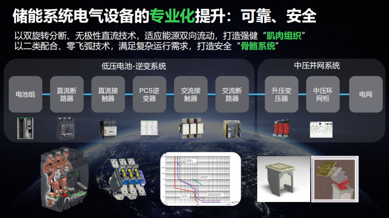 先看一下施耐德所倡導的三重架構,從底端的互聯(lián)互通的設備來實現(xiàn)現(xiàn)場級別的快速有效的運維,到云端實現(xiàn)對整個系統(tǒng),全生命周期的資產(chǎn)的管理還有優(yōu)化,通過這種開放,兼容的三層架構在儲能系統(tǒng),在新能源系統(tǒng)達到一個最優(yōu)的管理平衡。首先第一個主題就是我們剛剛說的如何來提升全生命周期整個電力系統(tǒng)的可靠性。把一個電力系統(tǒng)打開之后可能有低壓配電系統(tǒng)還有中壓配電系統(tǒng),構成安全性可靠性的很重要的一點。對整個電力系統(tǒng)來說是整個在儲能系統(tǒng)當中受環(huán)境影響性比較大,相對來說可能造成的損失不多但是造成的頻次是最高的,看一下從低壓配電到高壓配電,其實里面可以看到,比較核心的就是說像里面儲能系統(tǒng)電池輸出的,有的時候用熔斷器保護,相對來說具有比較穩(wěn)定可靠性的組合方案將比熔斷器更加可靠性。我們知道儲能系統(tǒng)很大的一個特點在于儲能的流動是雙向的,電池側進行充電也有可能由電池側向電網(wǎng)側進行放電,在選型設備的時候,對里面尤其是直流側的在使用當中的時候,它里面的核心關鍵這里面具有一個直流的極性,在使用當中的時候,必須要滿足要求,最高達到1500V在進行滅弧分段時會達到正常電壓的2000V的檔次,要求這個元件必須不具有極性,因為普通的光伏系統(tǒng)大家知道可以光伏的電能量到電直板如何保證元氣核心件的沒有極性的安裝使用是在選型當中一個關鍵,打造這種堅強的肌肉系統(tǒng)還有骨骼系統(tǒng)的核心。