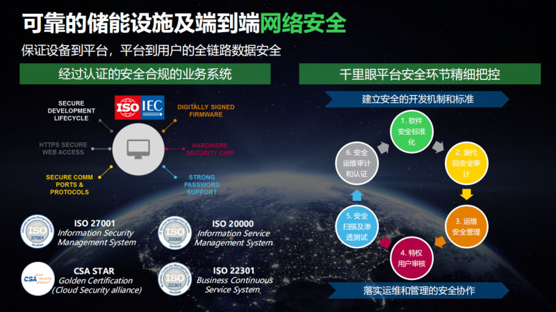 最后說安全,安全是一個永恒的話題,我們一般很多我們認為智能化代表著不安全,因為智能化可能過分的強調智能化,代表的就是開放性或者可控性會下降,但是并非如此,這里看到其實系統(tǒng)安全分為硬件還有軟件兩個層次,包含數(shù)據(jù)的安全還有應用。如果從我們自己打開一個安全系統(tǒng)來說分兩個層次,第一個如何衡量一個系統(tǒng),或者儲能管理系統(tǒng)是否安全,看它是不是符合標準,比如說這里面全部的國際標準,看一個比較重點的ISO27001,它所實現(xiàn)的關鍵的管理系統(tǒng),對系統(tǒng)進行認證,是一個體系認證,ISO27001將是一個很關鍵的因素?,F(xiàn)在成為國際標準,修改過了若干版,這一系列角度對信息系統(tǒng)提出安全。從軟件的標準化代碼的安全性到特權審核,才能保證從內部,所以說施耐德的安全系統(tǒng),尤其是電力管理的系統(tǒng),內部的時候有非常強的內控性,保證用戶在使用當中的時候不會出現(xiàn)兩大問題,一個問題是信息的損失還有信息的丟失。這邊不多說,因為儲能系統(tǒng)對我們來說大家非常專業(yè),可以回顧看到在底層的神經(jīng)元還有肌肉骨骼到云端的全系列管理,可以實現(xiàn)在儲能挑戰(zhàn)的時候最優(yōu)化的設計。
