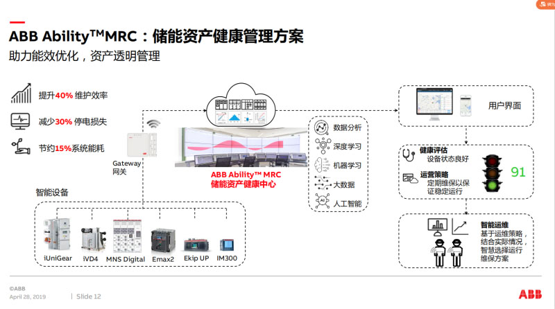 中壓真空斷路器一般沒有什么保護(hù)功能,ABB在高安全可靠的VD4中植入了一些數(shù)字化技術(shù),iVD4在開關(guān)觸臂中嵌入了無線傳輸?shù)臏囟缺O(jiān)測傳感器,還有對(duì)合分線圈和電動(dòng)儲(chǔ)能的監(jiān)測,電動(dòng)的底盤車,柜體內(nèi)部可視化。通過MDC4可以連接到ABB Ability云平臺(tái),通過這些數(shù)據(jù)分析診斷,還有可以像社交網(wǎng)絡(luò)那樣非常簡單地推送有關(guān)信息。MNS digital低壓數(shù)字化開關(guān)柜也是ABB的原裝柜,MNS digital數(shù)字化技術(shù)主要體現(xiàn)在柜體溫升監(jiān)測,在抽屜里面做了一個(gè)一體化的溫升監(jiān)控模塊,饋電和電動(dòng)機(jī)回路有一個(gè)管理模塊,模塊可以按需擴(kuò)展,通信采用環(huán)路結(jié)構(gòu)實(shí)現(xiàn)冗余系統(tǒng),保證通信更加安全可靠,通信速度更快,是傳統(tǒng)通信網(wǎng)絡(luò)的數(shù)百倍,超大的傳輸數(shù)據(jù)量,可對(duì)開關(guān)柜運(yùn)行狀態(tài)進(jìn)行大數(shù)據(jù)分析??梢酝ㄟ^智能移動(dòng)終端下載APP進(jìn)行參數(shù)在線設(shè)置,可以與其它智能控制系統(tǒng)連接,也可以通過ABB Ability上我們的配電云平臺(tái)。4月17日在杭州紹興參加2019中國自動(dòng)化產(chǎn)業(yè)年會(huì), ABB EDCS獲得了年度最具價(jià)值解決方案獎(jiǎng),實(shí)現(xiàn)“配電室入口袋”,通過智能移動(dòng)終端可以了解和掌控你的整個(gè)儲(chǔ)能系統(tǒng)。Ekip COM HUB可以植入到Emax2,脫扣器要配液晶屏的那種,Emax2要配置通信模塊,Ekip Up是用于儲(chǔ)能數(shù)字化升級(jí)改造的,這個(gè)也要帶通信口。Emax需配置通信模塊和電壓模塊,Tmax也是要帶通訊模塊,并且要配電子式脫扣器。S200通過配置CMS700可以上配電云平臺(tái)??蛻魧?duì)儲(chǔ)能電站全生命周期的資產(chǎn)管理也有一定的需求,ABB MRC儲(chǔ)能資產(chǎn)健康管理方案,通過智能化的現(xiàn)場設(shè)備和各類傳感器,ABB MRC資產(chǎn)健康管理中心已建立各種數(shù)據(jù)模型,對(duì)監(jiān)測數(shù)據(jù)進(jìn)行深度分析,結(jié)合大數(shù)據(jù),進(jìn)行自主學(xué)習(xí),可以實(shí)現(xiàn)儲(chǔ)能資產(chǎn)智慧管理。Ekip UP是儲(chǔ)能數(shù)字化升級(jí)方案,如果是現(xiàn)在建設(shè)的或者以前老的儲(chǔ)能設(shè)備,我們怎樣升級(jí),有Ekip Up就非常簡單,不占空間,不用淘汰老設(shè)備,并且可以兼容第三方設(shè)備。這是大型儲(chǔ)能電站解決方案,ABB北京一家工廠可以生產(chǎn)整套的儲(chǔ)能設(shè)備,也可以由儲(chǔ)能設(shè)備生產(chǎn)商進(jìn)行配套集成,在PCS直流側(cè)有直流專用Emax DC、Tmax DC、S200MDC,還有ABB光伏專用的電氣產(chǎn)品。這是小型儲(chǔ)能電站解決方案,核心配套電氣產(chǎn)品有S200、F200、CMS700、OVR等。在儲(chǔ)能電能質(zhì)量方面,ABB今年有新的產(chǎn)品,多功能模塊化PQactiF 有源濾波器和 PQflexC 混合補(bǔ)償用有源無功方案,模塊化設(shè)計(jì),可以16 個(gè)模塊組合,允許混合使用,響應(yīng)時(shí)間短,可選開環(huán)或閉環(huán)控制。在儲(chǔ)能電站防雷接地方面,ABB Furse綜合雷電防護(hù)解決方案具有優(yōu)良的導(dǎo)電性和熱穩(wěn)定性,耐腐蝕,使用壽命長,后續(xù)維護(hù)成本低,接地電阻低,熱熔焊方式,省時(shí)省力,無虛焊點(diǎn),連接更可靠。