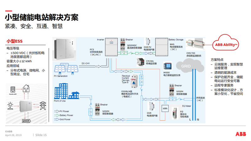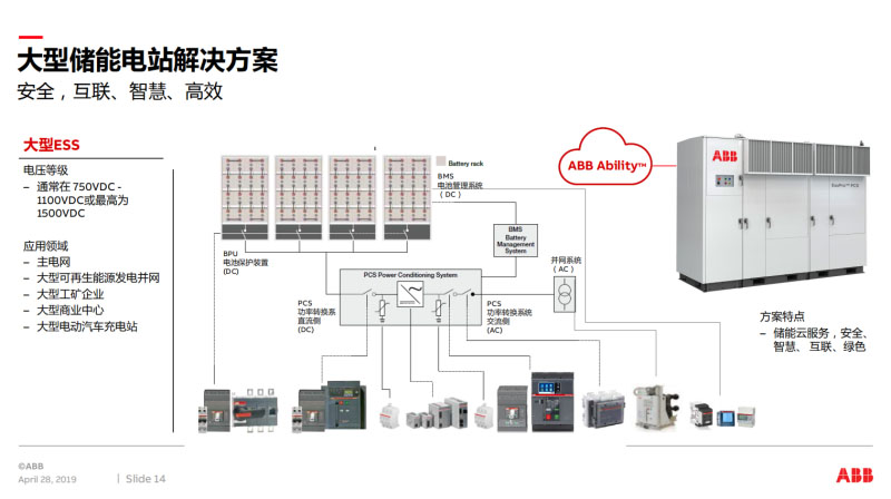 這是ABB電氣事業(yè)部在儲(chǔ)能行業(yè)的一些主要的應(yīng)用方案,第一個(gè)方案是儲(chǔ)能數(shù)字化解決方案,還有四個(gè)方案,大型儲(chǔ)能電站方案,小型儲(chǔ)能電站方案,儲(chǔ)能電能質(zhì)量解決方案,儲(chǔ)能防雷接地方案,總共有五個(gè)解決方案。這是在儲(chǔ)能電站的一個(gè)整體方案構(gòu)架,在現(xiàn)場主要是各種智慧設(shè)備和智能傳感器,這里主要列舉了iUniGear、、iVD4、MNS Digital、Emax2、Tmax XT、Ekip Up、EM300等。我們在數(shù)字配電、能效管理,還有就是整個(gè)儲(chǔ)能電站的資產(chǎn)管理管理,以前舊的或者現(xiàn)在新建的儲(chǔ)能電站有數(shù)字化升級(jí)需求的。第三部分就是運(yùn)用層,在ABB Ability系統(tǒng)里開發(fā)的各種儲(chǔ)能應(yīng)用。