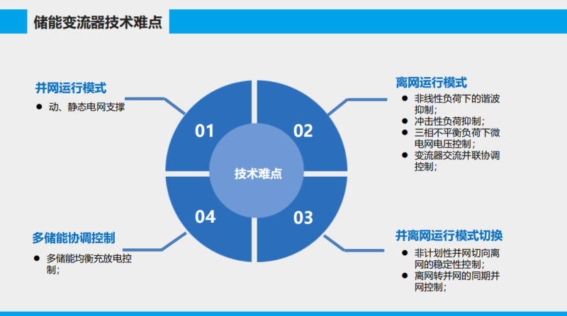 第一部分是儲(chǔ)能變流器關(guān)鍵技術(shù),產(chǎn)品的核心競爭力體現(xiàn)在高可靠性、低成本、高效率、電網(wǎng)穩(wěn)定控制能力。高可靠性要有完善的保護(hù)功能和充分的實(shí)驗(yàn)測(cè)試。低成本不但是變流器本身低成本,還有導(dǎo)致的系統(tǒng)低成本。高效率通過先進(jìn)的拓?fù)?、調(diào)制技術(shù)和交直流混合供電策略等實(shí)現(xiàn)。電網(wǎng)的穩(wěn)定控制能力體現(xiàn)在平抑發(fā)電功率波動(dòng)、改善電能質(zhì)量、支撐電網(wǎng)電壓和頻率。變流器的優(yōu)化設(shè)計(jì)首先是拓?fù)浣Y(jié)構(gòu)的改進(jìn),從以前的1000V系統(tǒng)的兩電平、T型三電平到高壓1500V系統(tǒng)的I型三電平,效率越來越高,而且隨著輸入輸出電壓的提升,整個(gè)系統(tǒng)的成本都在降低。多臺(tái)PCS并聯(lián)接雙繞組變壓器,取代雙分裂變壓器,再加上單機(jī)功率的提升,變壓器的功率可以越來越大,變壓器的成本越來越低。多臺(tái)PCS的并聯(lián)是通過PWM載波同步實(shí)現(xiàn),這種控制方式下會(huì)極大抑制并聯(lián)環(huán)流。PCS的技術(shù)難點(diǎn)主要在四個(gè)方面:第一是并網(wǎng)運(yùn)行模式,動(dòng)、靜態(tài)電網(wǎng)支撐;第二是離網(wǎng)運(yùn)行模式,這是主要難點(diǎn)所在,非線性負(fù)荷下的諧波抑制,沖擊性負(fù)荷抑制,三相不平衡負(fù)荷下微電網(wǎng)電壓控制,可以采用三相電壓的正負(fù)序分離進(jìn)行控制,變流器交流并聯(lián)協(xié)調(diào)控制;第三是并離網(wǎng)運(yùn)行模式的切換,非計(jì)劃性并網(wǎng)切向離網(wǎng)的穩(wěn)定性控制,離網(wǎng)轉(zhuǎn)并網(wǎng)的同期并網(wǎng)控制;第四是多儲(chǔ)能均衡充放電控制。目前存量非常大的光伏電站有加裝儲(chǔ)能的需求,可以在電網(wǎng)側(cè)加裝,也可用雙向的變流器進(jìn)行直流側(cè)的儲(chǔ)能加裝改進(jìn)。直流側(cè)儲(chǔ)能改造的優(yōu)點(diǎn)是無需升壓變和交流線纜,成本低;直流側(cè)實(shí)現(xiàn)能量轉(zhuǎn)移,效率高;無需并網(wǎng)審批,手續(xù)簡。但直流側(cè)儲(chǔ)能改造的缺點(diǎn)是容易造成光伏逆變器MPPT控制出現(xiàn)誤差,影響發(fā)電效益。我負(fù)責(zé)了格爾木的一個(gè)直接側(cè)接入儲(chǔ)能的項(xiàng)目,能夠兼容各廠家的光伏逆變器。我們的儲(chǔ)能系統(tǒng)監(jiān)聽光伏逆變器和光伏電站監(jiān)控系統(tǒng)的通訊,通過特定的控制算法精確判斷光伏逆變器限電量,充放電過程不影響光伏逆變器的MPPT。這是一個(gè)整天的運(yùn)行曲線,系統(tǒng)效率大概90.5%,高于交流側(cè)儲(chǔ)能系統(tǒng)效率。我采用一種更先進(jìn)的控制系統(tǒng)軟件開發(fā)方法,優(yōu)化了控制流程,提升了開發(fā)效率。電氣仿真通常是使用MATLAB/SIMULINK仿真平臺(tái)采用Simpowersystem封裝子模塊庫實(shí)現(xiàn),SIMULINK提供了一個(gè)封裝子模塊庫Embedded Coder,它提供了相應(yīng)的封裝子模塊,能夠與仿真得到的控制模塊組成一個(gè)控制程序轉(zhuǎn)換模型,直接生成控制系統(tǒng)軟件程序。這頁P(yáng)PT左邊是一個(gè)電氣系統(tǒng)仿真模型圖,仿真通過后把Controller這個(gè)控制模塊拿出來,結(jié)合相關(guān)的Embedded Coder中的子模塊,構(gòu)建出PPT右邊顯示的源程序轉(zhuǎn)換模型,有兩個(gè)中斷,一個(gè)是ADC中斷,一個(gè)是串口通訊中斷,還有主循環(huán)程序模塊,將它編譯在CCS里自動(dòng)生成相應(yīng)的控制系統(tǒng)軟件程序,這一方法能夠極大地提高產(chǎn)品開發(fā)進(jìn)程。變流器在微電網(wǎng)當(dāng)中的應(yīng)用分共交流母線和共直流母線兩類,通過微網(wǎng)控制柜跟電網(wǎng)之間實(shí)現(xiàn)連接,具有無縫切換功能。
