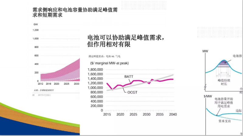 更多的資源怎么用呢?從這個發(fā)電系統(tǒng)運行層面,市場機制負荷靈活發(fā)電,這個電網(wǎng)儲能各個方面我們都認為要發(fā)揮作用,但是我們也看一下這個成本,縱軸成本應(yīng)該說是目前為止我們要更多的利用低成本的一些技術(shù),包括一些標準,市場設(shè)計,負荷響應(yīng),靈活性來提升?,F(xiàn)在這個火電的靈活性也在全面的推開,大范圍的電網(wǎng)互聯(lián)在增加,右側(cè)的儲能我們認為現(xiàn)在儲熱簡單易行的,在北方地區(qū)供熱系統(tǒng)可能做了一些嘗試,增加一些儲熱能力,學(xué)習(xí)丹麥的經(jīng)驗。這個電站也是最主要的資源,化學(xué)儲能按照目前的這種是幾年前做的,按照目前這種成本是成本比較高的,隨著儲能技術(shù)下降,這個成本要往下降。更多的利用成本越來越高的一些技術(shù),儲電目前看來比較高的,隨著比重的增加儲能發(fā)揮著越來越多的作用。大部分儲能在協(xié)同發(fā)展?jié)摿Γ褡髠?cè)這個圖是可再生能源發(fā)電的比重,占到的絕大部分的比重,右側(cè)電動汽車是重要的一個將來儲能的潛力市場,分析到2050年的時候,全部的新興車都是這個電動化的汽車,當然包括一些氫燃料汽車我們認為要發(fā)揮作用的,未來這個潛力比較大的,我們做了相關(guān)的一些分析,這個圖應(yīng)該上面是發(fā)電側(cè),橙色部分是波動性的風(fēng)電加光伏。下面這個圖是需求側(cè)的,整合的負荷再加上我們這個電動汽車的靈活的一些智能的充電,我們看一下就是這些新能源電動汽車怎么協(xié)同的,發(fā)揮的機制是什么?是價格,供需還有價格。這個黑色的線就是價格,隨著這種電力供需供應(yīng)過剩白天的時候,太陽能幾十億甚至二十億千瓦的光伏出電的時候,動力供應(yīng)是充足的,甚至過剩的。那個時候價格是充電的,光伏下降的時候,供應(yīng)相對不足的,那個時候充電就是價格的充電時間要轉(zhuǎn)移的。