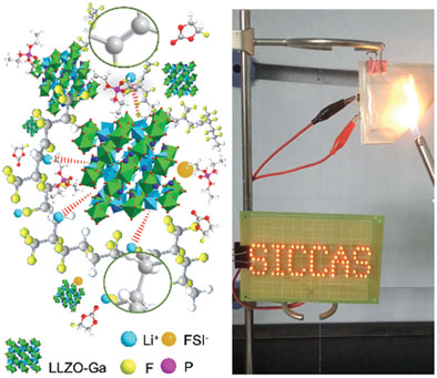中國儲能網(wǎng)訊:最近,中國科學院上海硅酸鹽研究所溫兆銀研究員團隊通過離子導電型引發(fā)劑實現(xiàn)了凝膠聚合物電解質(zhì)的原位制備,該凝膠聚合物電解質(zhì)具有優(yōu)異的耐火性能,基于該電解質(zhì)組裝的固態(tài)鋰電池在同時承受剪切與火燒條件(火焰溫度528℃)下仍能為發(fā)光二極管陣列供電,使鋰電池的安全性大大提高。相關工作申請了中國發(fā)明專利,主要研究結(jié)果以“In Situ Generated Fireproof Gel Polymer Electrolyte with Li6.4Ga0.2La3Zr2O12 As Initiator and Ion-Conductive Filler”為題發(fā)表在國際頂級期刊Advanced Energy Materials(IF=21.875)上,論文第一作者為上海硅酸鹽所在讀博士研究生徐東,導師為溫兆銀研究員。