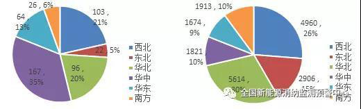 一季度各區(qū)域新增(左)、累計(jì)(右)并網(wǎng)風(fēng)電裝機(jī)(萬千瓦)