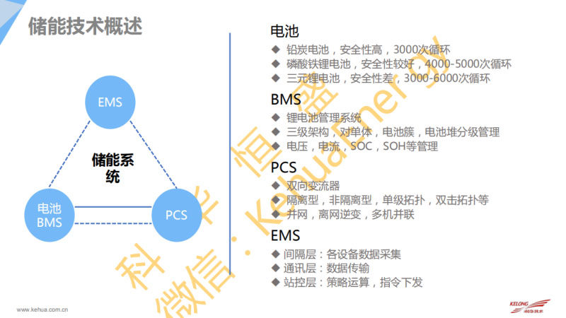 我們的電池管理系統(tǒng)是必不可少的。要提高電池在儲(chǔ)能使用中的性價(jià)比。現(xiàn)在主要的BMS的應(yīng)用主要分為三級(jí)架構(gòu),主流技術(shù)路線都是三級(jí)架構(gòu)。對(duì)單體、電池簇以及電池堆分級(jí)管理。主要是電壓、電流、SOC、SOH進(jìn)行管理。電池是直流電,連接到電網(wǎng)必不可少的就是PCS。PCS就是將直流電轉(zhuǎn)換為交流電,再轉(zhuǎn)換為直流電,就是雙向變流器?,F(xiàn)在市面上有隔離型的,可能多用于用戶側(cè)。還有一些非隔離型的,用于發(fā)電測(cè)和電網(wǎng)側(cè)。還有一些單級(jí)拓?fù)浜碗p級(jí)拓?fù)?。還有包括在這次會(huì)議中也聽說了很多新的技術(shù)路線,比如不需要變壓器可以直接升壓。PCS關(guān)鍵技術(shù)主要是并網(wǎng)運(yùn)行和離網(wǎng)逆變包括并離網(wǎng)之間的切換還有多機(jī)并聯(lián)的技術(shù)以及VSG虛擬同步機(jī)技術(shù)。最后,是儲(chǔ)能系統(tǒng)必不可少的一個(gè)管理系統(tǒng)就是EMS。一個(gè)就是采集層,對(duì)于儲(chǔ)能系統(tǒng)里面的設(shè)備進(jìn)行采集。接下來就是通訊層,還有站控層,實(shí)現(xiàn)策略的運(yùn)算和指令的下發(fā)。