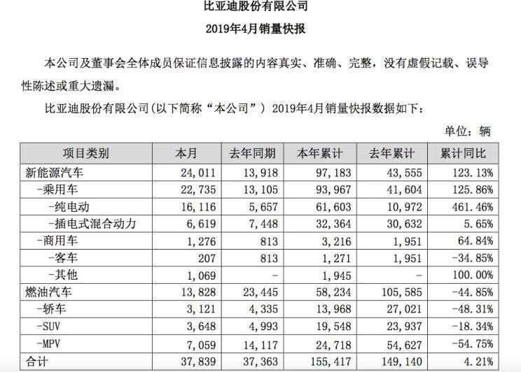 5月10日,比亞迪(002594)發(fā)布4月銷量快報(bào),快報(bào)顯示,比亞迪4月新能源汽車銷量24011輛,與去年同期13918輛相比,同比增長超過72%;新能源汽車本年累計(jì)銷量9.72萬輛,同比增長123.13%。此外,比亞迪還披露,公司2019年4月新能源汽車動(dòng)力電池及儲能電池裝機(jī)總量約為1.625GWh,本年累計(jì)裝機(jī)總量約為5.591GWh。