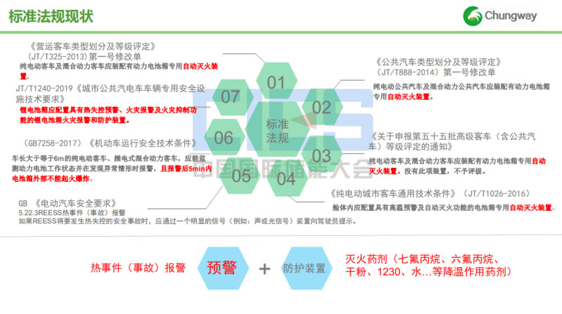 目前隨著電動(dòng)汽車火災(zāi)事故事件和社會(huì)影響力的不斷發(fā)酵,今天下午一位專家報(bào)告中也統(tǒng)計(jì)報(bào)告了多起的火災(zāi)事故。我們看一下,韓國的儲(chǔ)能電站事故目前影響也比較大,國內(nèi)也有幾起儲(chǔ)能項(xiàng)目事故??梢姶笠?guī)模的儲(chǔ)能電池堆火災(zāi)事故一旦發(fā)生就會(huì)造成嚴(yán)重后果,只有通過數(shù)據(jù)在線檢測,實(shí)現(xiàn)早期熱事故預(yù)警,才能有效防止安全事故發(fā)生,做到防患于未燃,同時(shí)與電池管理系統(tǒng)、電氣系統(tǒng)和消防系統(tǒng)進(jìn)行融合聯(lián)動(dòng)控制,才能有效保護(hù)儲(chǔ)能電站的安全。從法規(guī)方面看,汽車標(biāo)準(zhǔn)比較活躍,從2014年發(fā)展新能源汽車一直到現(xiàn)在出臺了不少關(guān)于電動(dòng)汽車安全方面的交通行業(yè)標(biāo)準(zhǔn)。可以看到JT/T1240標(biāo)準(zhǔn)3月1日開始實(shí)施,標(biāo)準(zhǔn)中提出了預(yù)警和防護(hù)。針對電化學(xué)儲(chǔ)能電站消防方面標(biāo)準(zhǔn)缺失,目前關(guān)于滅火劑和滅火措施的有效性均未得到有效性驗(yàn)證,需要針對儲(chǔ)能電站的消防安全進(jìn)行系統(tǒng)性深入性的研究?,F(xiàn)在是各個(gè)地區(qū),北京、山西、江蘇省出臺了相應(yīng)的地標(biāo),已經(jīng)提供了一個(gè)的安全防護(hù)思路。大家可以在會(huì)后找一下相應(yīng)的文件。對于研究團(tuán)隊(duì)來說,團(tuán)體標(biāo)準(zhǔn)有幾個(gè)聯(lián)盟在做一些相關(guān)的標(biāo)準(zhǔn)。在基礎(chǔ)研究方面清華、北理工、中科大等在做相關(guān)研究,我們做了多傳感器融合預(yù)警技術(shù)和不同滅火藥劑的應(yīng)用研究。這是電動(dòng)汽車鋰離子動(dòng)力電池的安全測試要求。對于附錄C中對熱事故檢測的參考。