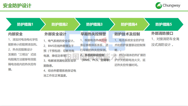 通過這些實(shí)驗(yàn)數(shù)據(jù),我們認(rèn)為整個(gè)儲(chǔ)能電站的安全防護(hù)系統(tǒng)的設(shè)計(jì)應(yīng)該是系統(tǒng)化的設(shè)計(jì),應(yīng)該同BMS、PCS、排風(fēng)或者紅外的熱成像視頻監(jiān)測等多重聯(lián)動(dòng),實(shí)現(xiàn)智慧立體的消防。遇到危險(xiǎn)狀況下,因?yàn)榧b箱受制于空間的問題,有的儲(chǔ)能是分布式的,消防車沒法進(jìn)去,你只能使用管道有效輸送到pack或者模組當(dāng)中去。我特意加了一張汽車的,汽車就這么使用的,每個(gè)pack進(jìn)行一個(gè)防護(hù)。對于儲(chǔ)能來說,對系統(tǒng)安全融合、數(shù)據(jù)共享進(jìn)行聯(lián)動(dòng)是必然的趨勢。比如因?yàn)閮?chǔ)能電站電池起火以后,不一定是爆炸對人產(chǎn)生危險(xiǎn),可能產(chǎn)生的燃燒產(chǎn)生的毒性氣體,可能導(dǎo)致人身危險(xiǎn)。我們的主張是在每一個(gè)儲(chǔ)能里面,pack首先要進(jìn)行安全防護(hù),對電池箱單元體、電池柜、儲(chǔ)能集裝箱淹沒防護(hù)和外部消防應(yīng)急接口設(shè)置四重消防保護(hù)。每級火災(zāi)防控的火災(zāi)探測器自動(dòng)啟動(dòng)滅火,緊急狀況下可通過手動(dòng)啟動(dòng)滅火,也可通過消防主站后臺系統(tǒng)啟動(dòng)消防裝置,不同滅火介質(zhì)分階段介入。