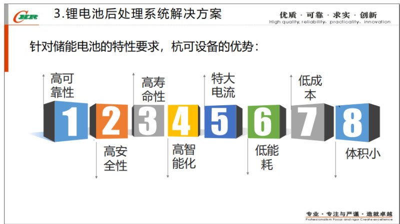 我們目前的鋰電池都是一些大電池的產(chǎn)品、大電流的產(chǎn)品、高功率的產(chǎn)品,所以對于它的能量消耗客戶是非常關(guān)注的,所以我們在充電和放電效率目前來講,充電效率能達到85%,放電效率回收的效率能控制在82%。為了更大的能夠讓客戶獲得產(chǎn)能的提升,我們在體積小型化方面做了很多的努力,能夠讓目前我們設(shè)備使用的體積降低75%,就是說空間利用率能夠更得到一個提高。