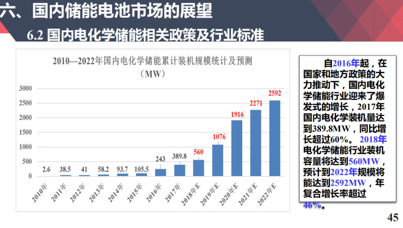 從所有二次電池中,鋰離子電池由于它自身的特點(diǎn),在整個(gè)儲(chǔ)能領(lǐng)域是非常受歡迎的。2017年全球的化學(xué)儲(chǔ)能整個(gè)裝機(jī)59%是鋰離子電池,2017年新增的93%是鋰離子電池;2018年這次儲(chǔ)能會(huì)之后秘書(shū)長(zhǎng)可能會(huì)公布更新的2018年的數(shù)據(jù)。從2011年—2017年整個(gè)全球的鋰電市場(chǎng)發(fā)展來(lái)看,鋰電池由于成本、技術(shù)、政策等原因,市場(chǎng)可以說(shuō)還處于導(dǎo)入期。預(yù)計(jì)“十三五”末期能達(dá)到千億的市場(chǎng),甚至在不久的將來(lái)化學(xué)儲(chǔ)能能達(dá)到萬(wàn)億的市場(chǎng),我認(rèn)為這個(gè)預(yù)測(cè)太過(guò)于樂(lè)觀了。我們應(yīng)該理性的看待儲(chǔ)能這樣一個(gè)市場(chǎng)。的確是在增加、的確是在發(fā)展,但是我們不能把它看的樂(lè)觀了。