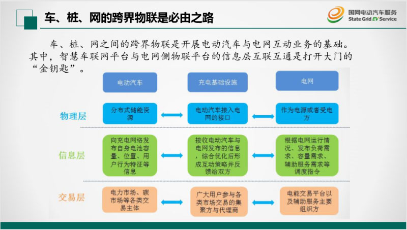后面介紹一下泛在電力物聯(lián)網(wǎng)可以帶來什么,今年年初國家電網(wǎng)公司提出來的,非常重要的戰(zhàn)略轉(zhuǎn)型,過去主要是重點建設(shè)堅強的智能電網(wǎng),現(xiàn)在要打造兩網(wǎng),結(jié)合堅強的智能電網(wǎng)和泛在電力物聯(lián)網(wǎng)打造能源互聯(lián)網(wǎng)。要去實現(xiàn)能源互聯(lián)網(wǎng)必須要有信息跟物理的融合,通過能源互聯(lián)網(wǎng)可以去推進整個電力行業(yè)與用戶的充分交互,打造V2G應(yīng)用是建設(shè)電動汽車產(chǎn)業(yè)發(fā)展生態(tài)的重要一環(huán),已經(jīng)納入國家電網(wǎng)公司的泛在電力物聯(lián)網(wǎng)的計劃。