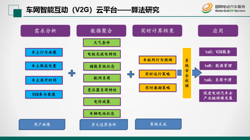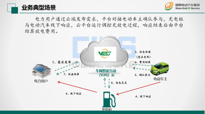 這個圖是電動汽車與電網(wǎng)互動的模式的路線圖,從一開始是無序充電,就是其他專家提到隨機充電,第二個有序充電,再后面是車網(wǎng)雙向互動,最后是實現(xiàn)了車網(wǎng)一體。我們考慮的是,把海量的電動汽車這個車載電池的資源,用作我們電網(wǎng)的巨大的電力海綿吸掉所有的多余電能,實現(xiàn)電動汽車在在正確的時間、正確的地點、去充放正確的電量,從而實現(xiàn)跟電網(wǎng)的充分互動。國家電網(wǎng)公司在車網(wǎng)互動領(lǐng)域已經(jīng)開展了很多工作,去年在全國多個省市開展了有序充電的應(yīng)用試點,今年會開展較大規(guī)模的有序充電推廣布局。目前我們公司除了配合總部開展有序充電業(yè)務(wù)以外,同時也在積極部署了我們的車網(wǎng)互動業(yè)務(wù),建設(shè)了我們的V2G示范項目,開發(fā)了我們的V2G應(yīng)用平臺,也做試點的項目,下一步做商業(yè)化。。