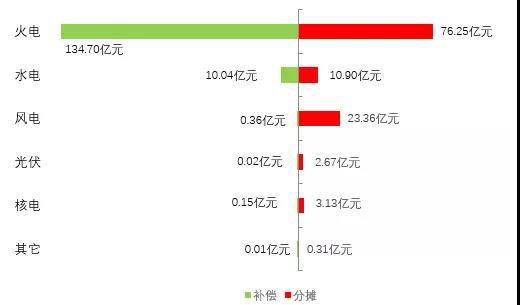從補(bǔ)償和分?jǐn)傎M(fèi)用的對(duì)比來(lái)看,火電實(shí)現(xiàn)凈收入,而風(fēng)電光伏為純支出。盡管火電分?jǐn)傎M(fèi)用達(dá)到76.25億元,占全部分?jǐn)傎M(fèi)用的比重為65.4%,但是獲得補(bǔ)償后,實(shí)現(xiàn)凈收入58.45億元。與火電對(duì)比鮮明的是風(fēng)電,分?jǐn)傎M(fèi)用23.36億元,占比為20%,純支出23億元。光伏分?jǐn)傎M(fèi)用占比小,占比為2.3%,純支出2.65億元。