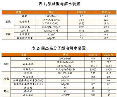 可再生能源制氫:為防止棄風棄光和限電,大規(guī)模利用可再生能源富余電力制氫,即電轉(zhuǎn)氣(P2G)技術(shù)已為市場普遍看好。日本已在福島建立了全球最大的單機10MW級的電解水裝備示范項目,最大年產(chǎn)量為900t,所制氫氣將用于2020年東京奧運村的供電和供熱。但要真正全面推廣P2G項目,降低成本和減少轉(zhuǎn)化損耗是關(guān)鍵。到2030年,電解水裝置成本要從20萬日元/kW降至5萬日元/kW,能耗從5kWh/Nm3減少至4.3kWh/Nm3。強堿型和固體高分子型(PEM)電解水裝備各項指標計劃見表1、2。