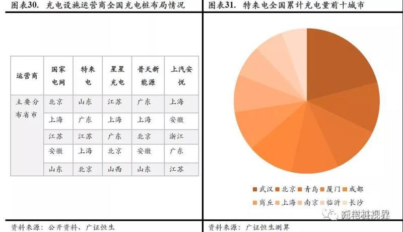 從目前各家充電設(shè)施運(yùn)營商的全國網(wǎng)點(diǎn)布局來看,數(shù)量排名前五的區(qū)域主要分布于北京、上海、廣東、江蘇、安徽、山東等。就具體城市而言,特來電目前充電數(shù)量居前的城市包括了武漢、北京、青島、廈門、成都等。從未來發(fā)展空間來看,一線城市和發(fā)達(dá)地區(qū)逐漸飽和,未來將有望逐漸向低線城市逐步滲透。
