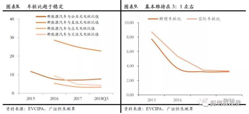 車樁比趨于穩(wěn)定,新增量取決于汽車保有量增長。截至2018Q3,我國電動車與公共充電樁的車樁比為7.76:1,與所有充電樁的車樁比為3.31:1。新增充電樁的車樁比來看,存量車樁比與新增車樁比正在接近,目前車樁比正在接近平衡位置。預(yù)計(jì)未來車樁比大概率將維持在3:1附近,今后充電設(shè)施新增需求更多依賴電動車保有量的上升而非車樁比的下降。